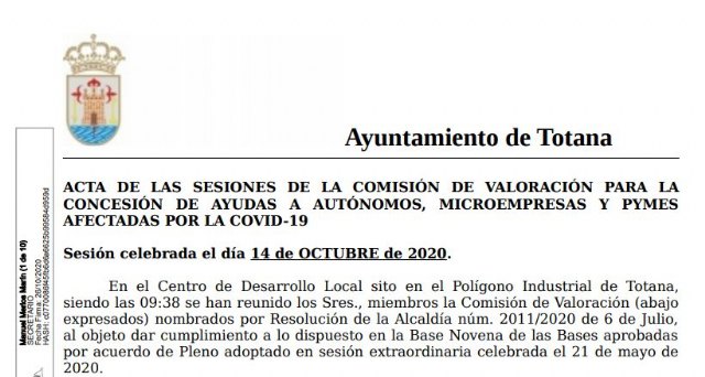El Ayuntamiento de Totana a través de los técnicos de las Concejalías de Desarrollo Local, Industria, Comercio y Turismo está completando el proceso comprobación y resolución de las solicitudes presentadas por las empresas totaneras para optar a las ayudas destinadas por el Ayuntamiento a los autónomos, microempresas y pymes afectados por el COVID19.