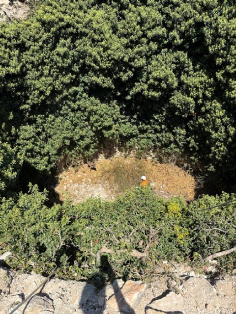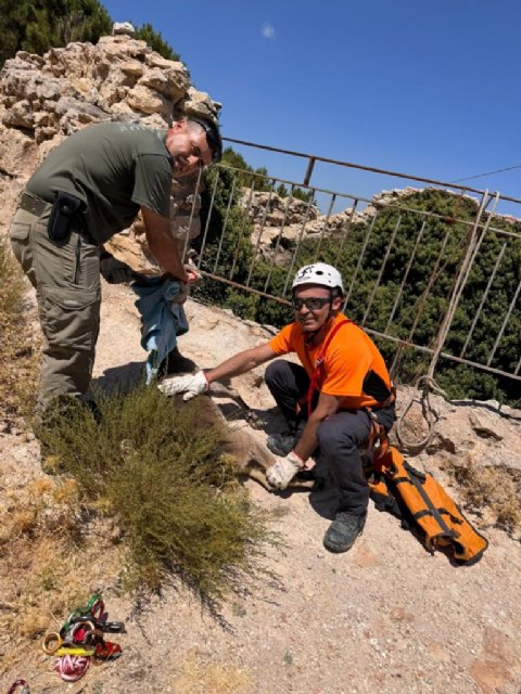 Agente medioambiental y voluntarios de la Unidad de Rescate en Montaña de Protección Civil de Aledo, han logrado rescatar a cabra montesa en los pozos de la nieve de Sierra Espuña, Totana